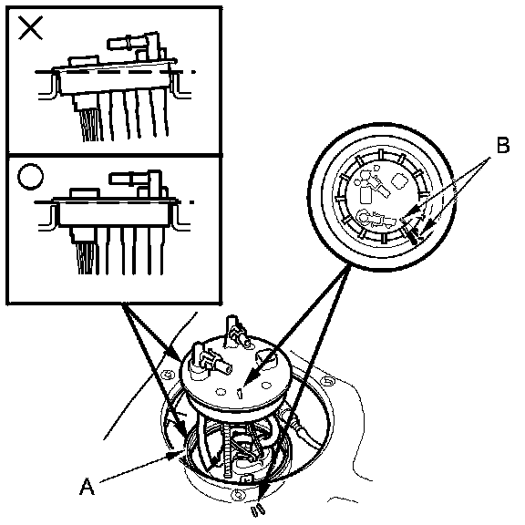 3. Align the marks (B) on the fuel tank and the fuel tank unit, then insert the fuel tank unit into the fuel tank until the fuel tank unit rests on top of the base gasket.