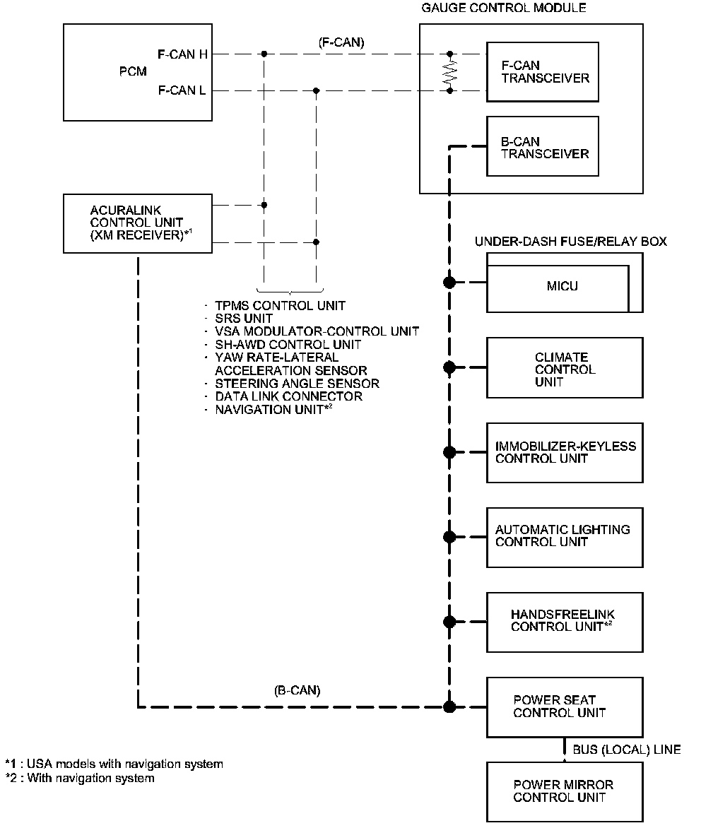 The gauge control module acts as a gateway to allow both systems to share information. The gauge control module translates and relays information from B-CAN to F-CAN and from F-CAN to B-CAN.