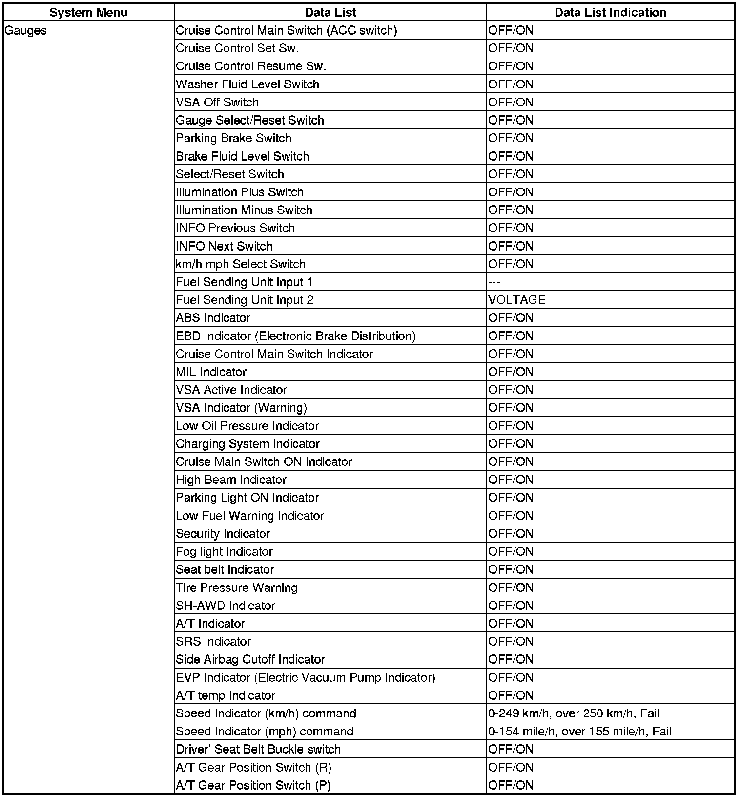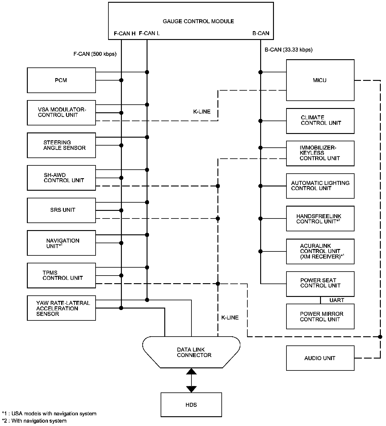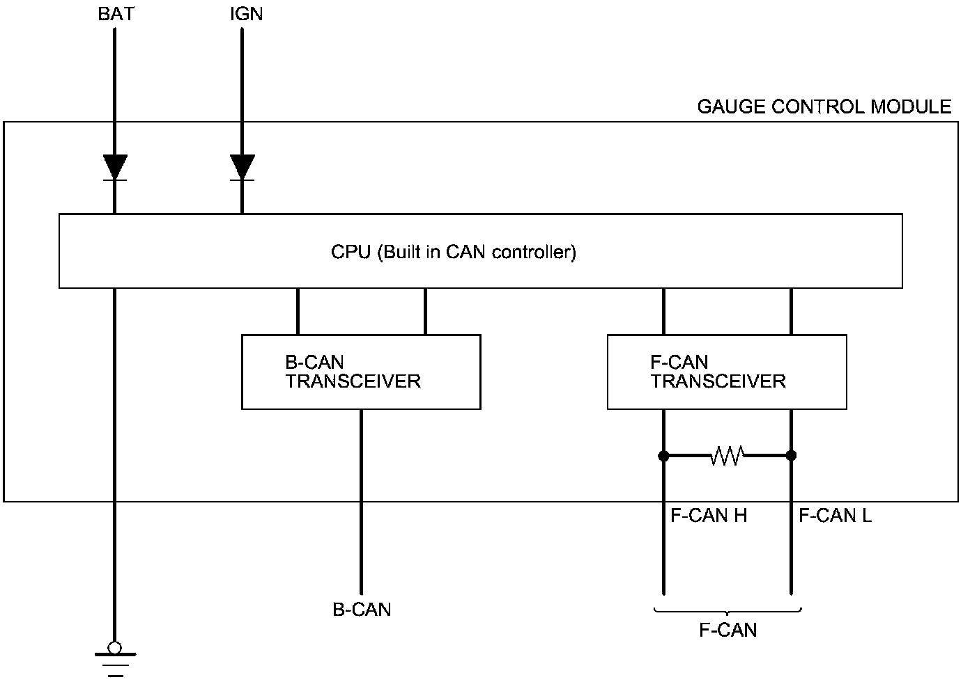 The body controller area network (B-CAN) and the fast controller area network (F-CAN) share information between multiple electronic control units (ECUs). B-CAN communication moves at a slower speed (33.33 kbps) for convenience related items and for other functions. F-CAN information moves at a faster speed (500 kbps) for "real time" functions such as fuel and emissions data. To allow both systems to share information, the gauge control module translates and relays the information from B-CAN to F-CAN and from F-CAN to B-CAN. This is called the Gate Way Function.