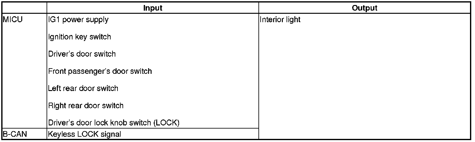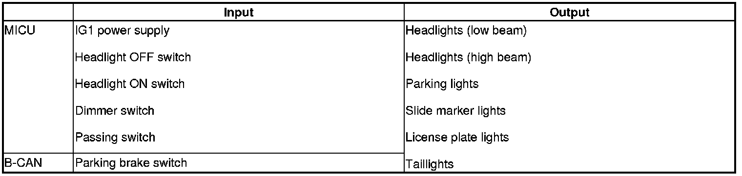 The MICU control of the automatic lighting system is based on input signals from each switch and B-CAN signals.