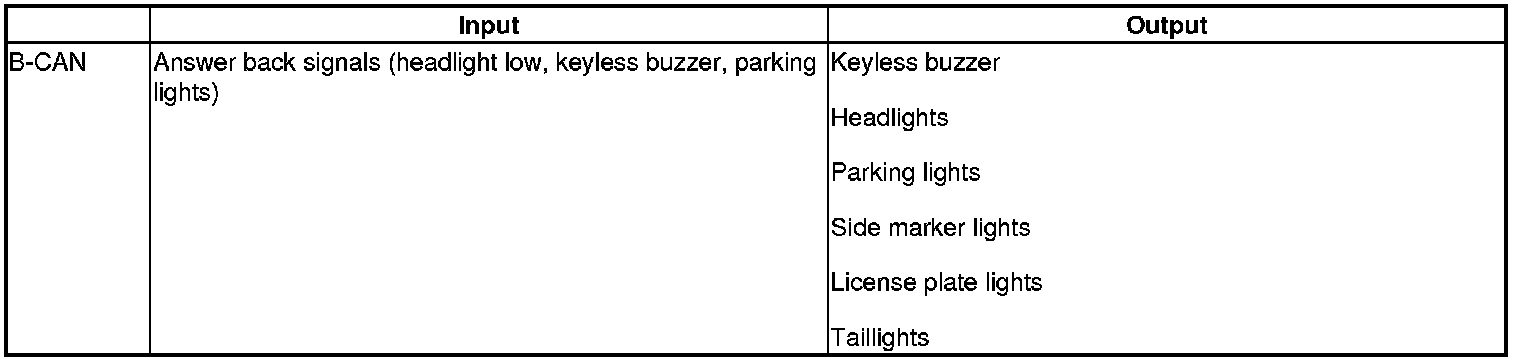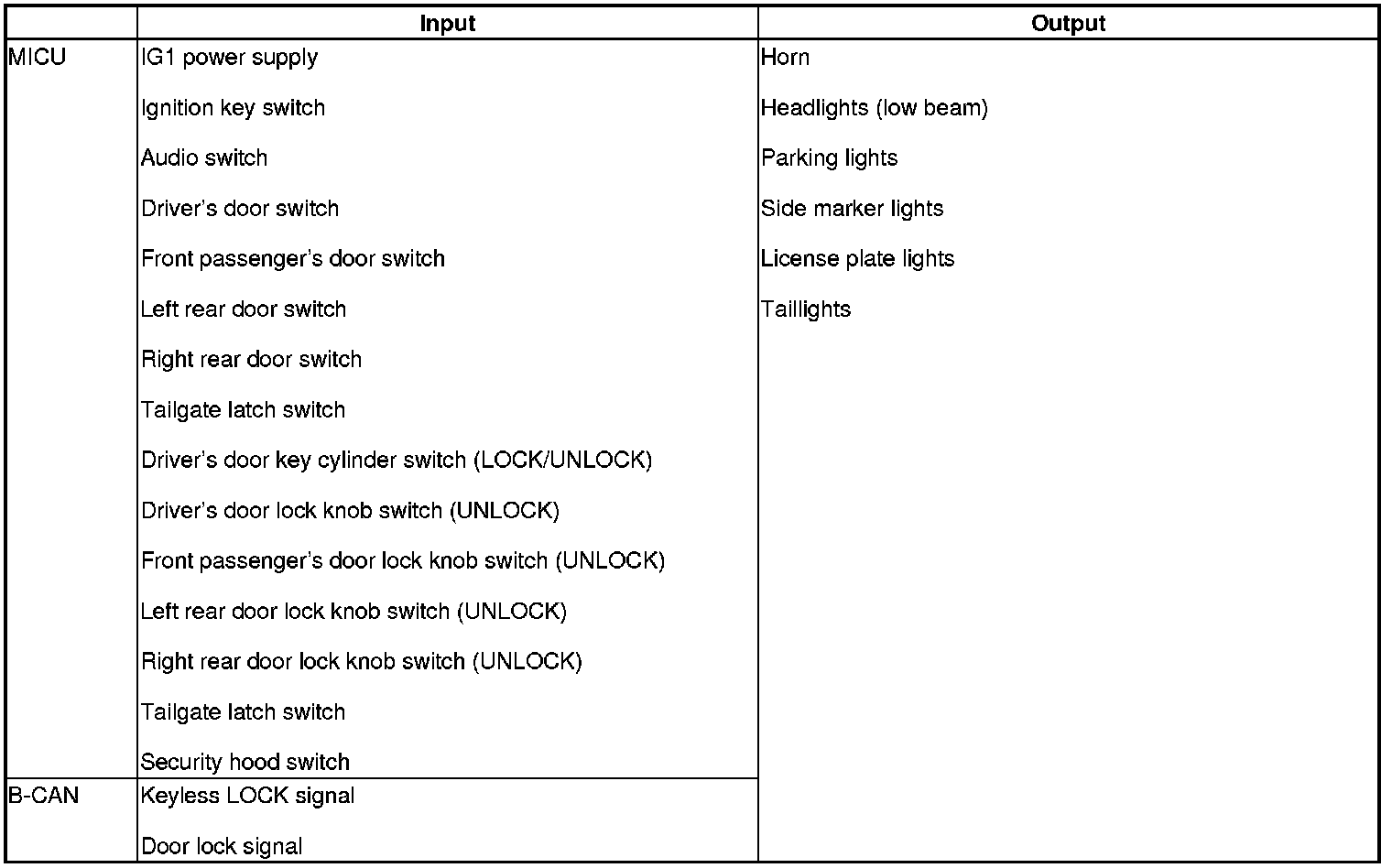 The MICU control of the lighting system and horn is based on input signals of each switch and the B-CAN signals.