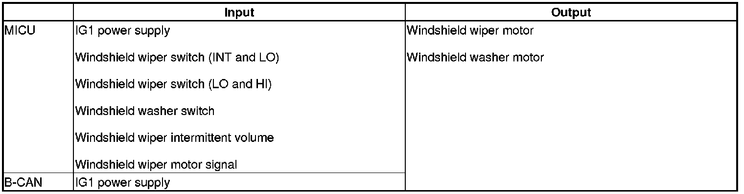 The MICU control of the windshield wiper motor and the washer motor is based on IG1, wiper/washer switch windshield wiper motor signals and the B-CAN signals.