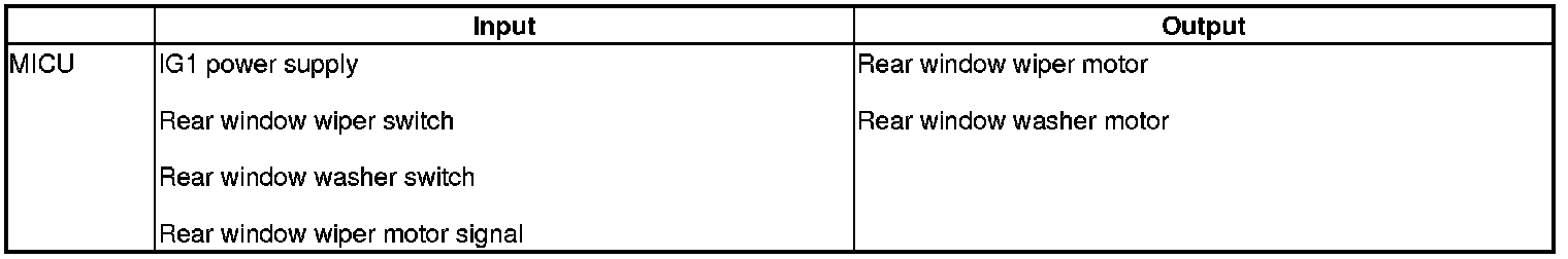 The MICU control of the rear window wiper motor and the washer motor is based on IG1, wiper/washer switch and the rear window wiper motor signals.