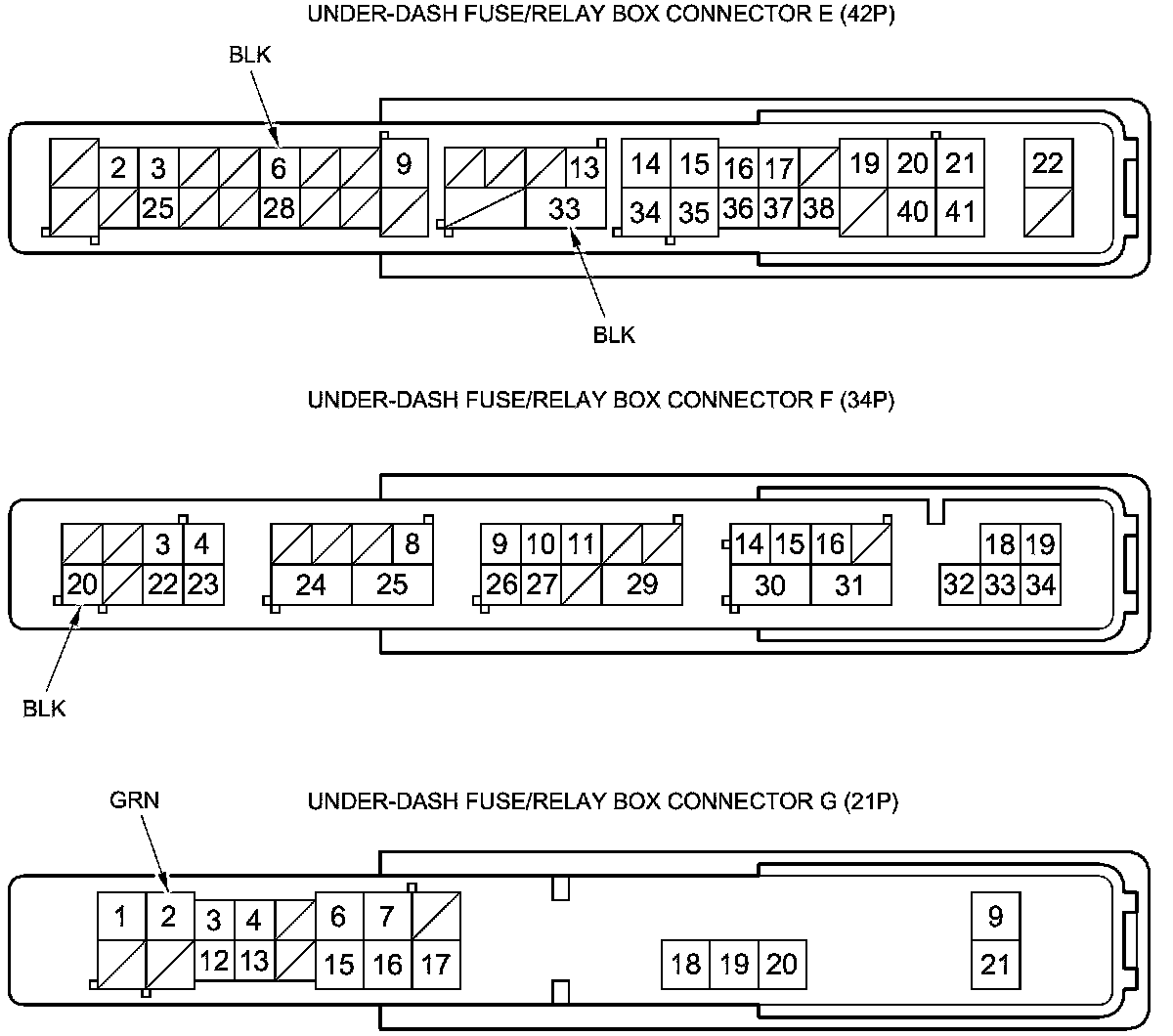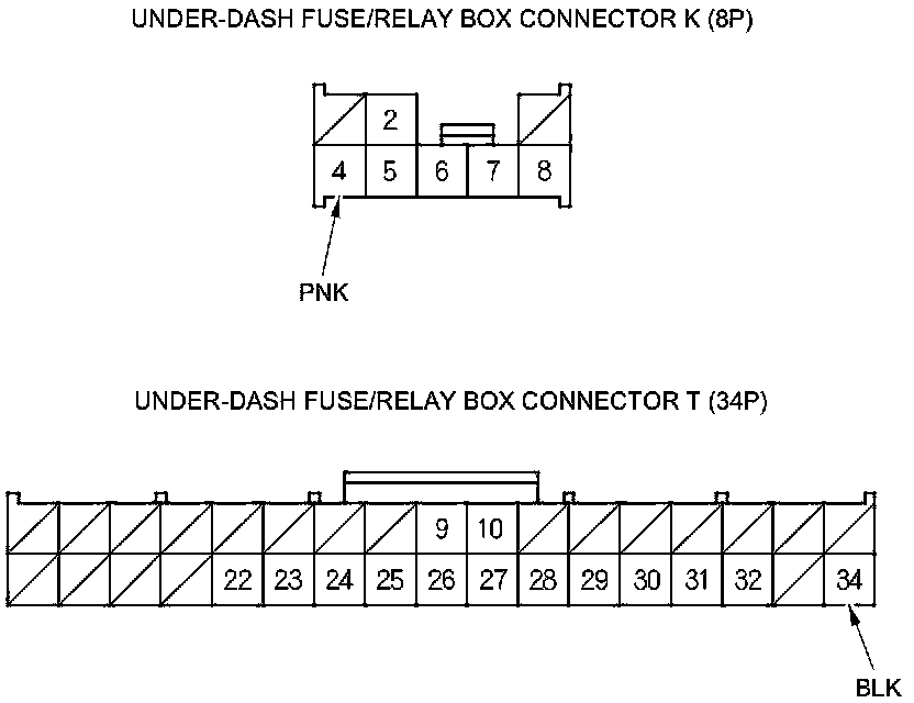 4. Disconnect under-dash fuse/relay box connectors E, F, G, K, and T.