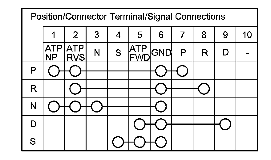 5. Transmission range switch test is finished if the test results are OK. If there is no continuity between any terminals, check that the transmission range switch installation. If the switch installation is OK, replace the transmission range switch Service and Repair.