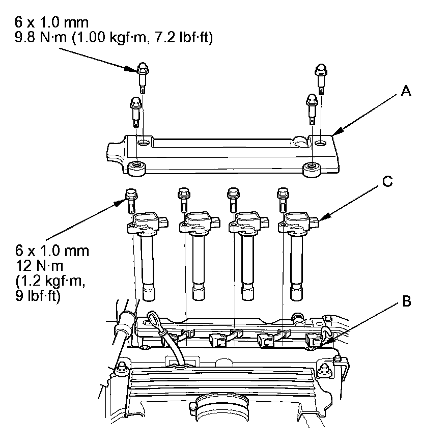 3. Disconnect the ignition coil connectors (B), then remove the ignition coils (C).