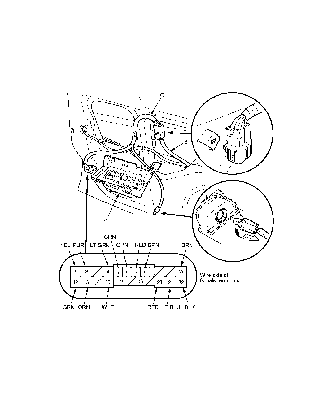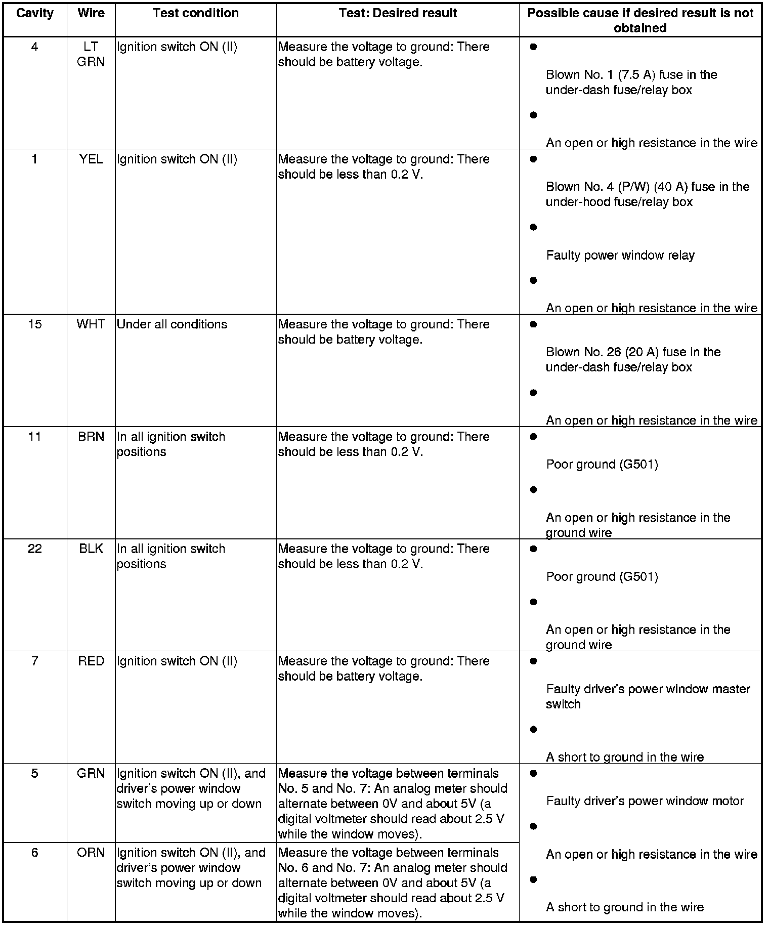 5. Reconnect the 22P connector to the power window master switch. Turn the ignition switch to ON (II), and do the following input tests: