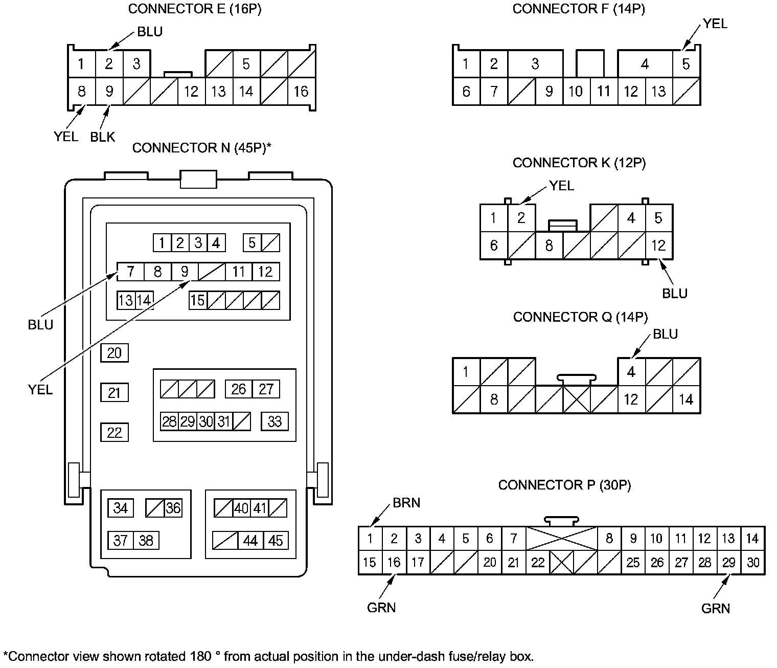 3. Disconnect driver's under-dash fuse/relay box connectors E, F, K, N, P, and Q.