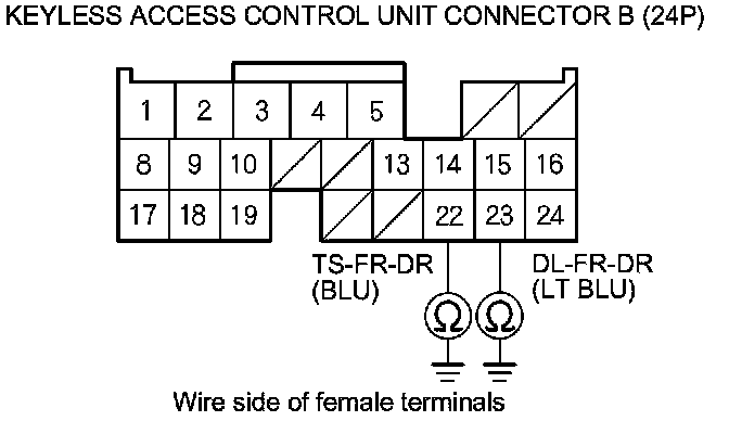 13. Check for continuity between keyless access control unit connector A (31P) terminals No. 19 and No. 20 and body ground (for front passenger's door touch sensor) or between keyless access control unit connector B (24P) terminals No. 22 and No. 23 and body ground (for driver's door touch sensor).
