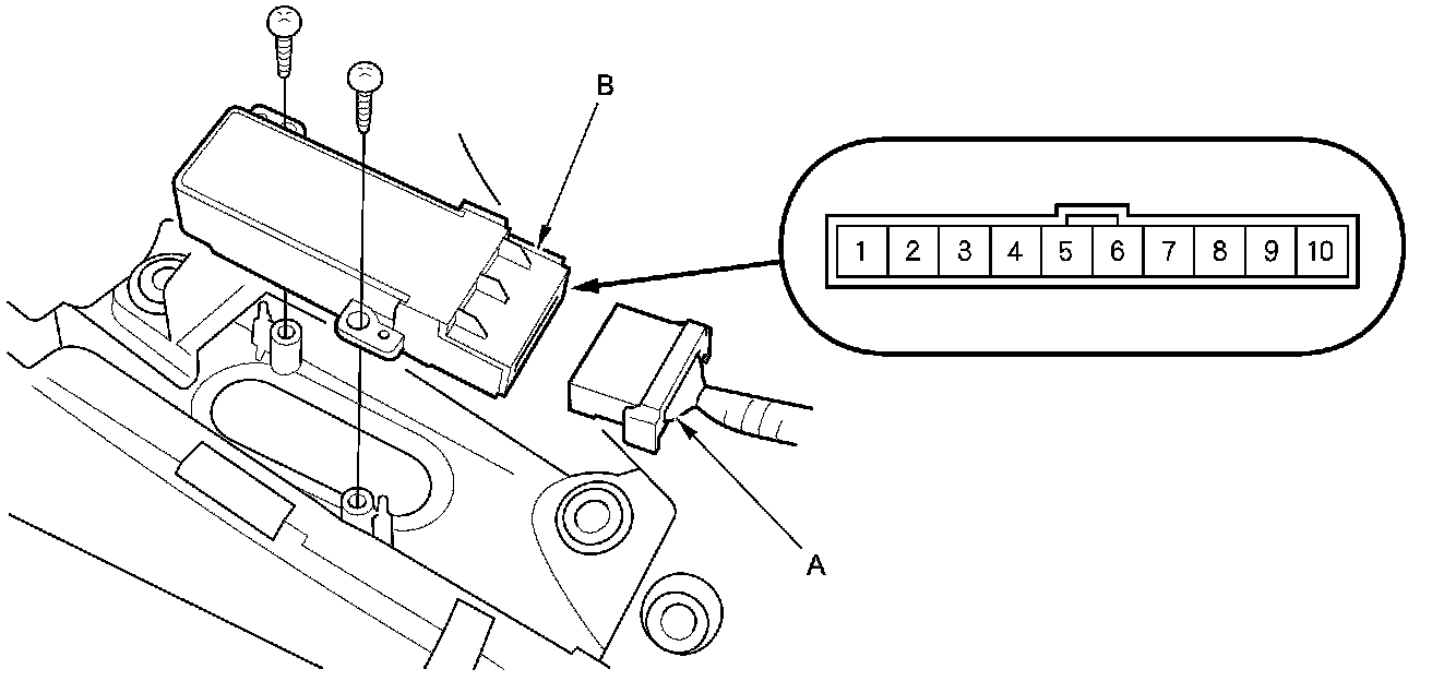 2. Disconnect the 10P connector (A) from the driving position memory switch (B).