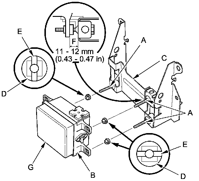 6. Tighten the main bracket bolts a little at a time until the clearance between the millimeter wave radar and the main bracket is 0.43-0.47 in (11-12 mm) (F). Make sure the millimeter wave radar is parallel with the main bracket.