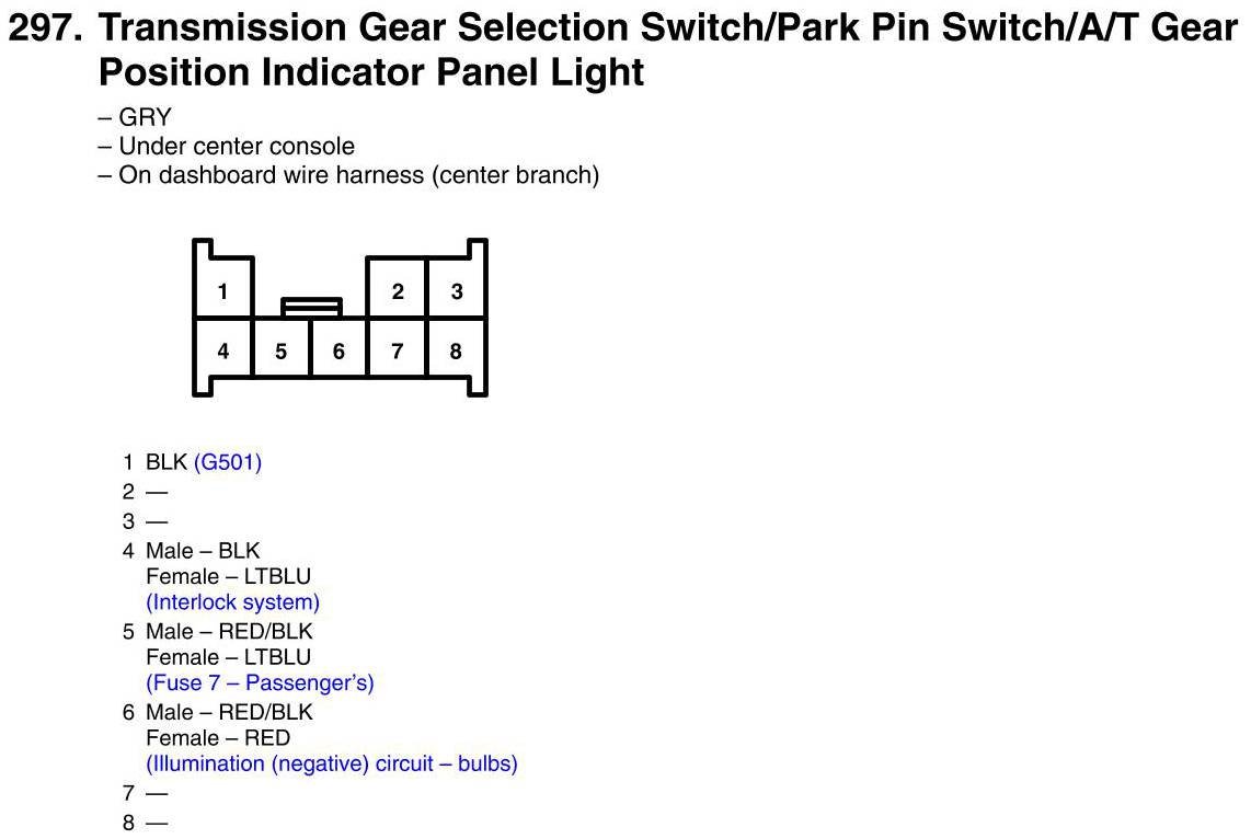 View 297 - Transmission Gear Selection Switch/Park Pin Switch/A/T Gear Position Indicator Panel Light Connector View