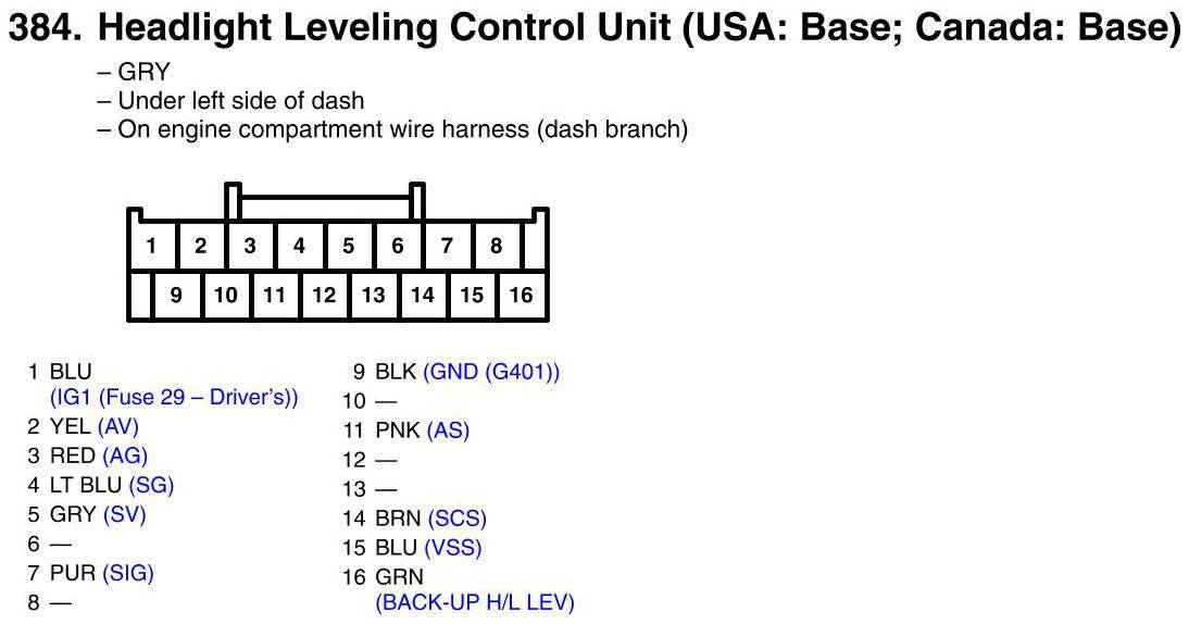 View 384 - Headlight Leveling Control Unit Connector View (USA: Base; Canada: Base)