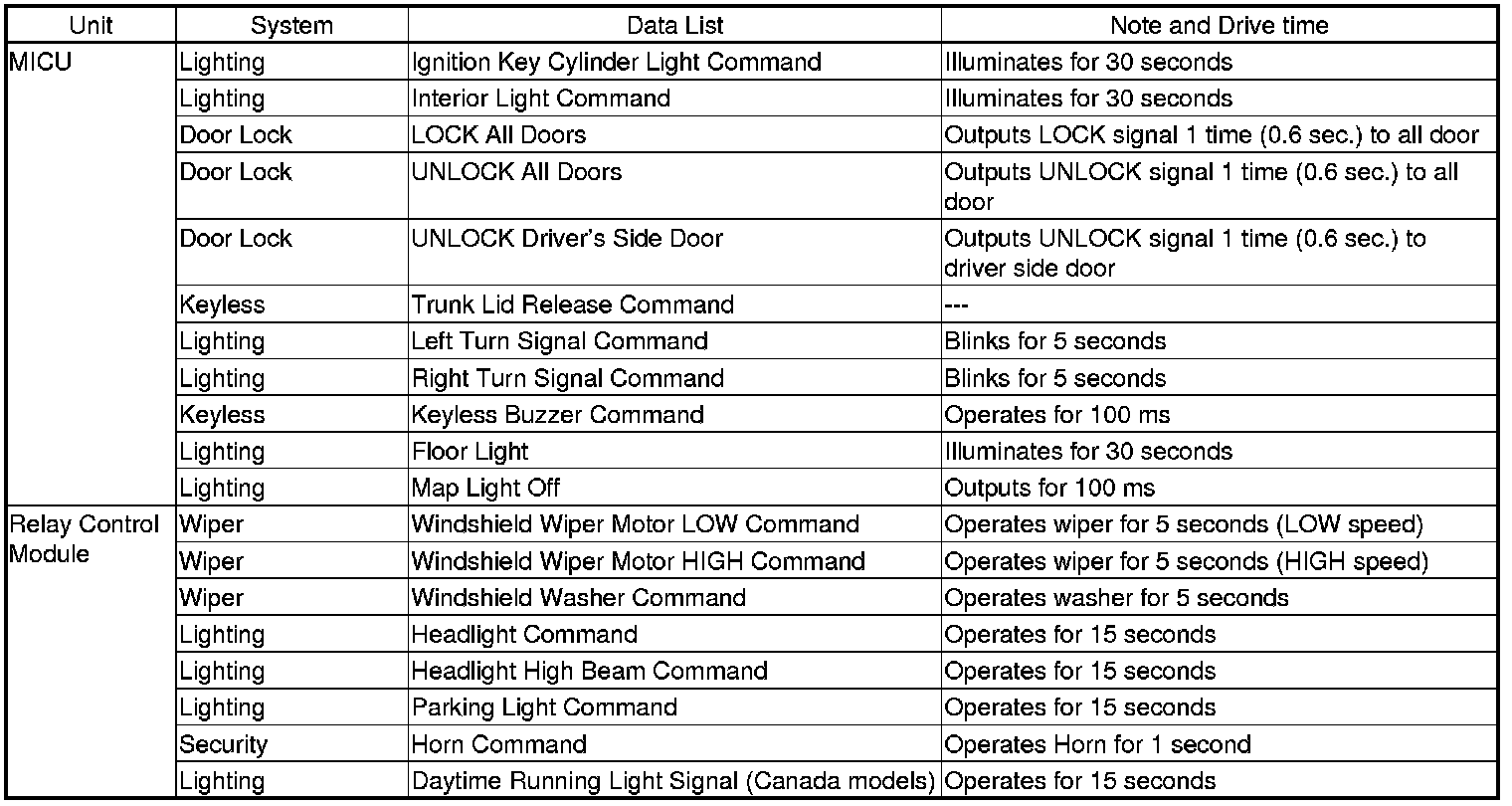 - The MICU, relay control module, gauge control module, and keyless access control unit receive the door lock switch message.