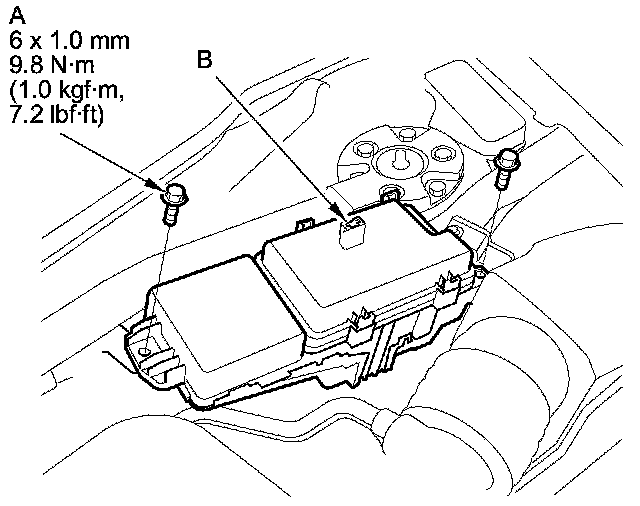 2. Remove the bolts (A) and clamp (B) securing the under-hood fuse/relay box.