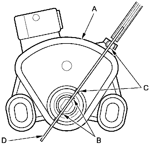4. Remove the spring clip (A) and the control pin (B), then separate the shift cable end (C) from the selector control lever (D).