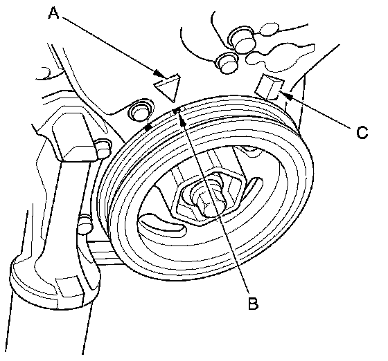 9. Aim the light toward the pointer (A) on the timing belt lower cover and the timing mark (B) on the crankshaft pulley. Check the ignition timing under a no load condition (headlights, blower fan, rear window defogger, and air conditioner are turned off).