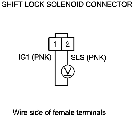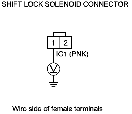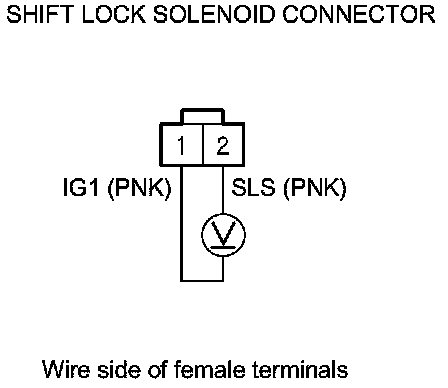 11. Release the brake pedal, and measure the voltage between shift lock solenoid connector terminals No. 1 and No. 2. The shift lever must be in P.
