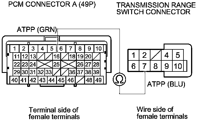 30. Check for continuity between PCM connector terminal A16 and transmission range switch connector terminal No. 7.