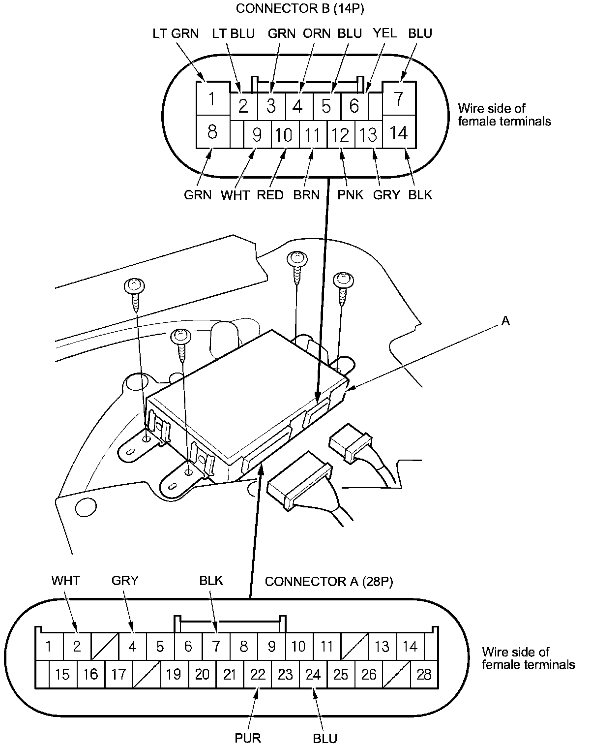 3. Disconnect front passenger's MPCS unit (A) connectors A (28P) and B (14P).