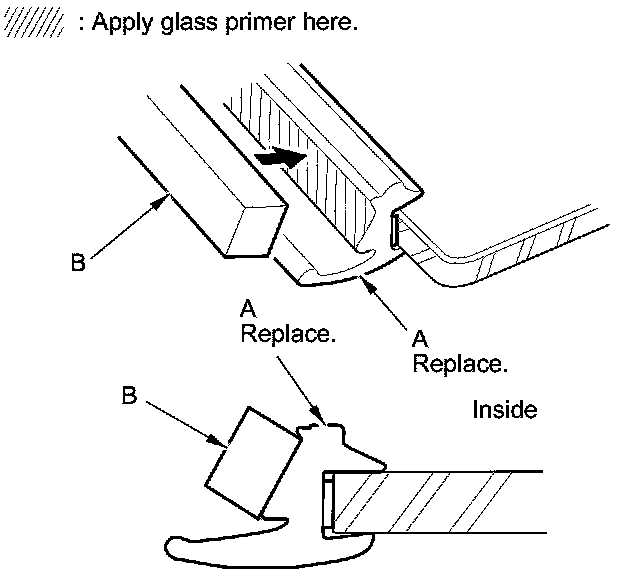 13. Apply glass primer to the windshield molding (A), then attach the windshield molding upper seal (B) with adhesive tape to the inside surface of the windshield molding as shown.