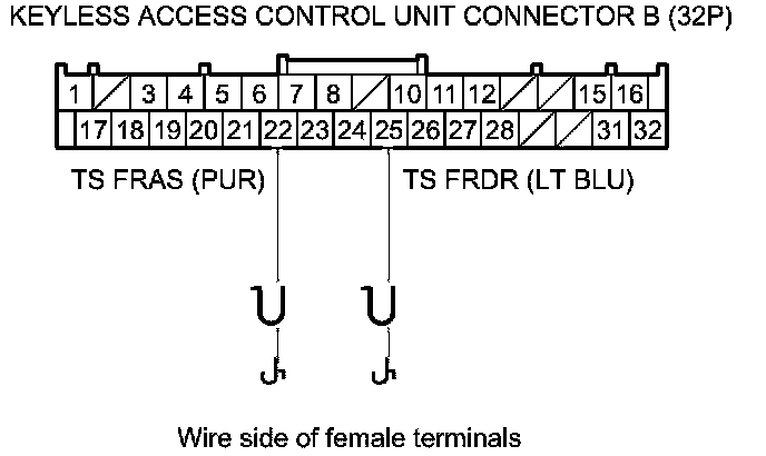 15. Check for continuity between keyless access control unit connector B (32P) terminal No. 22 and body ground (for front passenger's door touch sensor), or between keyless access control unit connector B (32P) terminal No. 25 and body ground (for driver's door touch sensor) individually.