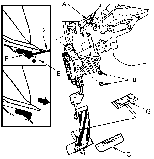 3. Remove the two mounting nuts (B), then remove the clip (C). Using a flat-tip screwdriver (D), push the lock (E), then remove the accelerator pedal pad (F) from the pedal stop (G).