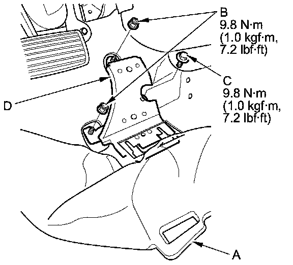 - If the pedal stop is damaged, replace it by pulling back the carpet (A), and removing the nuts (B), the bolt (C), and the pedal stop (D).