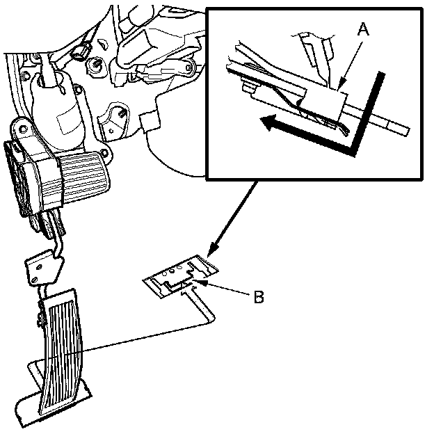 1. Install the accelerator pedal pad (A) to the pedal stop (B). Slide the pad until it locks with a clicking sound.
