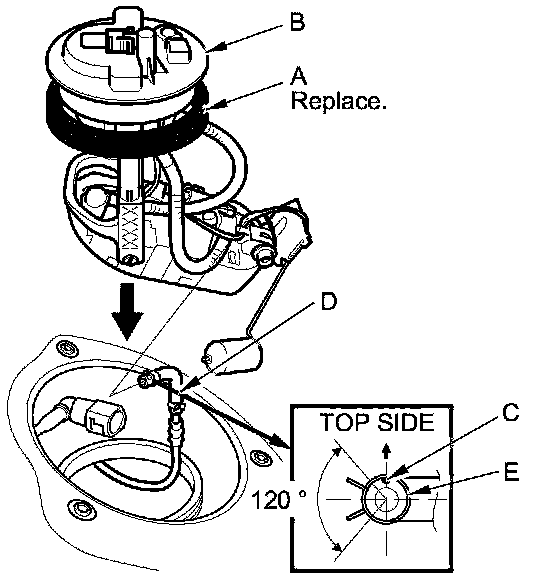 1. Temporarily attach a new base gasket (A) to the fuel tank unit (B), position the mark of the transfer tube (C) up, connect the transfer tube (D), then insert the fuel tank unit partially into the fuel tank.
