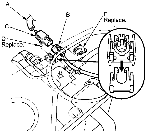 5. Install the parts in the reverse order of removal with a new O-ring (D) and a new retainer (E).
