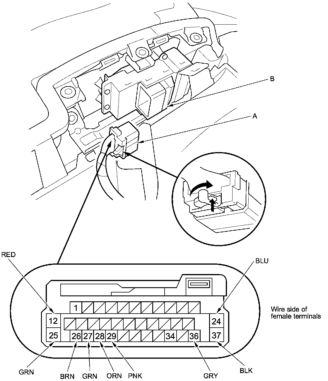 2. Disconnect the front passenger's power window switch 37P connector (A) from the front passenger's power window switch (B).