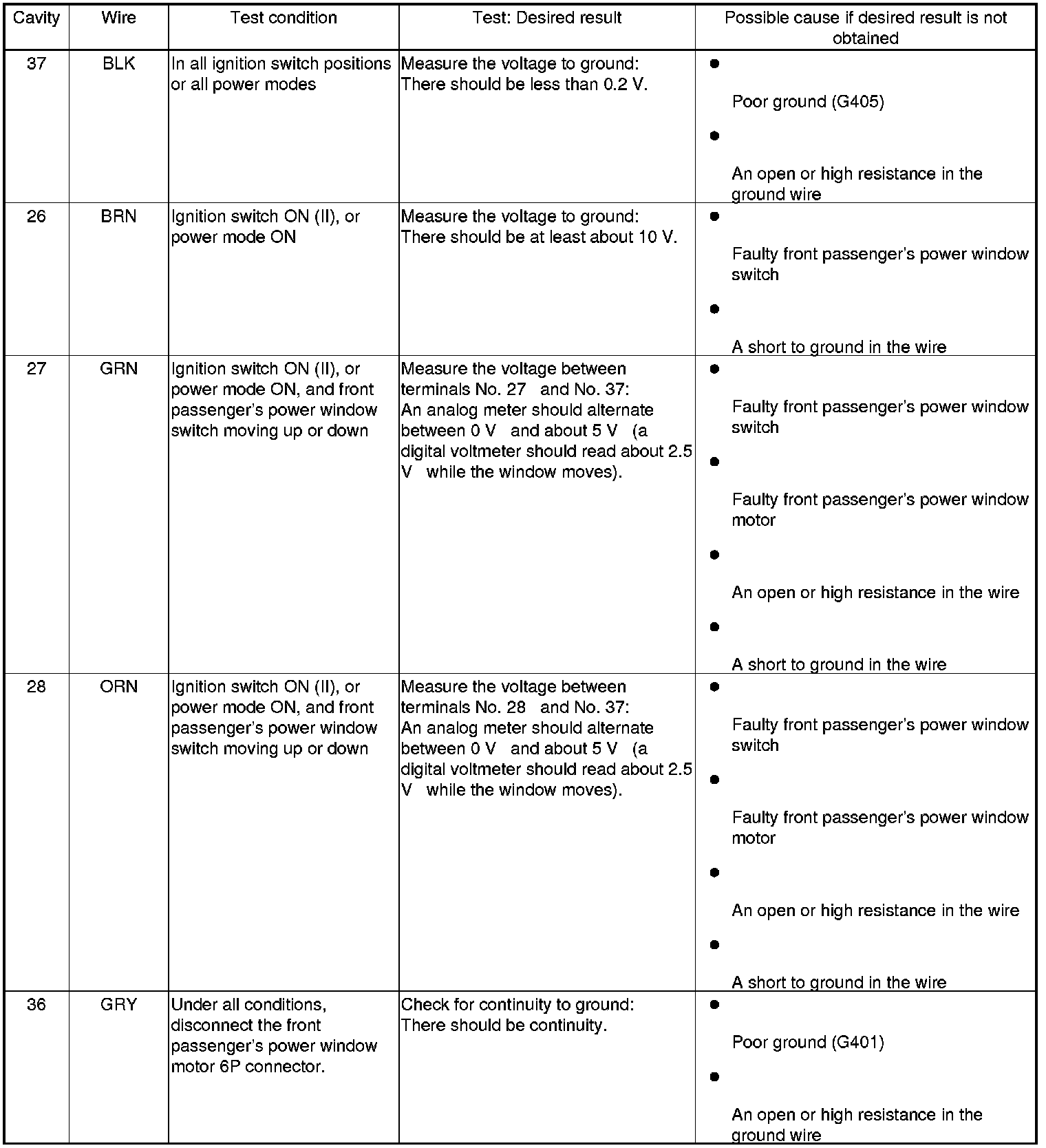 5. Reconnect the front passenger's power window switch connector to the front passenger's power window switch, and do the following input tests: