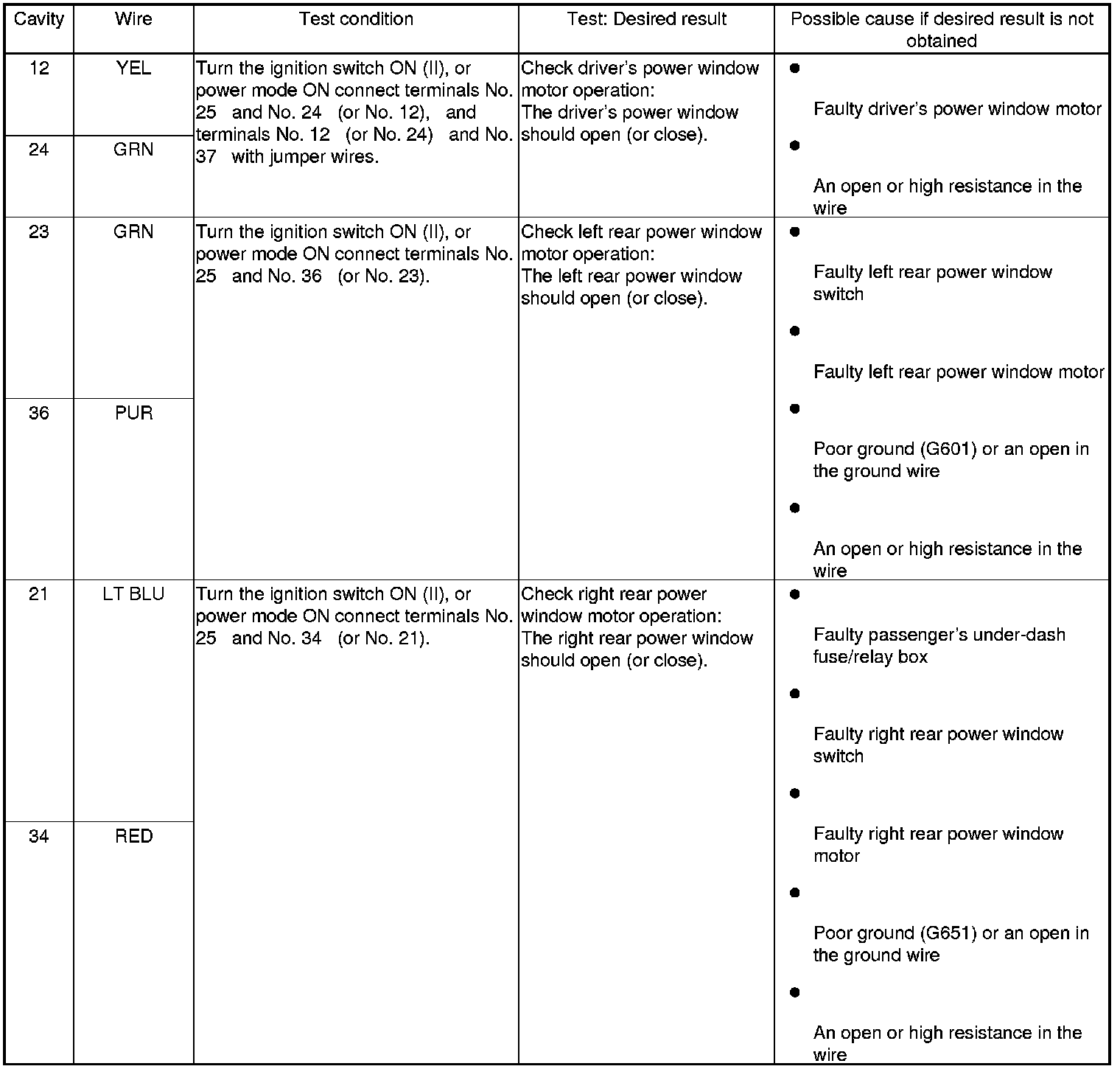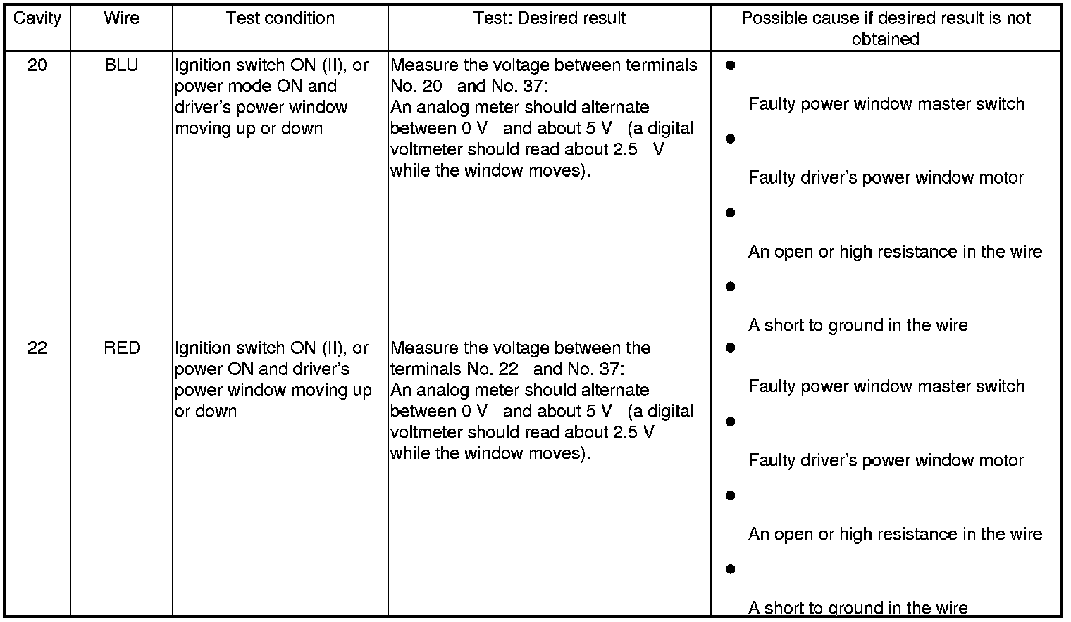 5. With the power window master switch 37P connector still disconnected from the power window master switch, do the following input tests: