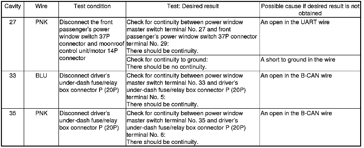 NOTE: Before testing, troubleshoot the multiplex integrated control unit first, using B-CAN System Diagnosis Test Mode A Troubleshooting - B-CAN System Diagnosis Test Mode A.