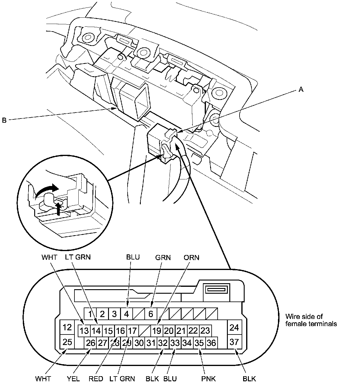 3. Disconnect the 37P connector (A) from the power window master switch (B).