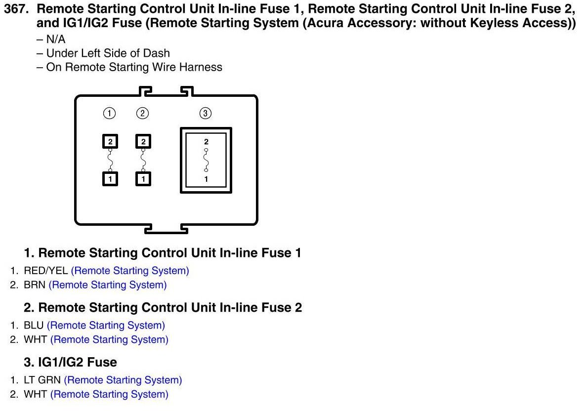 Home >> Acura >> 2011 >> TL FWD V6-3.5L >> Repair and Diagnosis >> Diagrams >> Connector Views >> Connector Views By View Number >> View 367 - Remote Starting Control Unit In-line Fuses 1, 2 and IG1/IG2 Fuse Connector View (Remote Start (without Keyless Acces