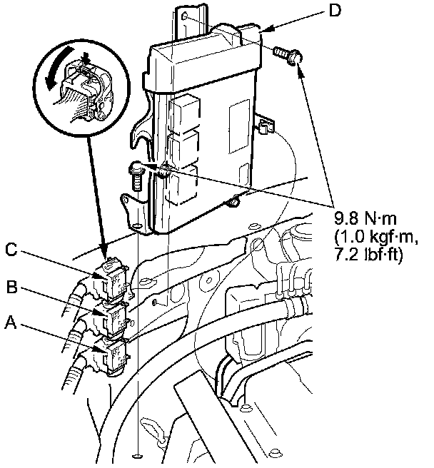 13. Disconnect ECM/PCM connectors A, B, and C, then remove the ECM/PCM assembly (D).