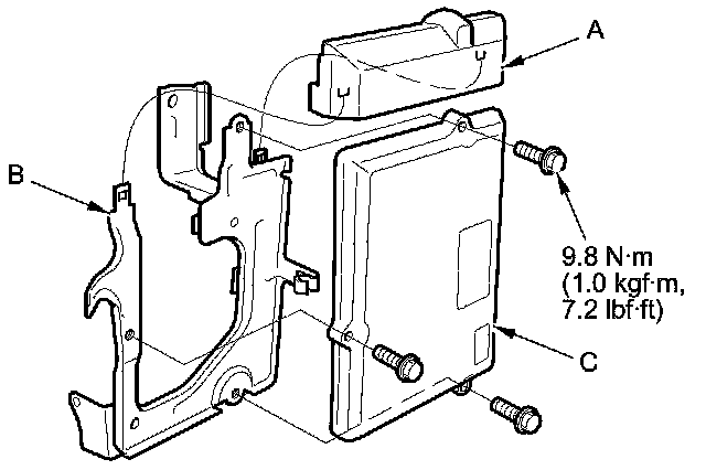 14. Remove the cover (A) and the bracket (B) from the ECM/PCM (C).