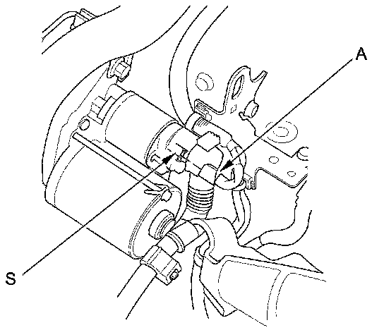 11. Make sure the shift lever is in neutral (M/T model) or P or N (A/T model), then disconnect the connector (A) from the starter S terminal. Connect a jumper wire from the battery positive terminal to the S terminal.