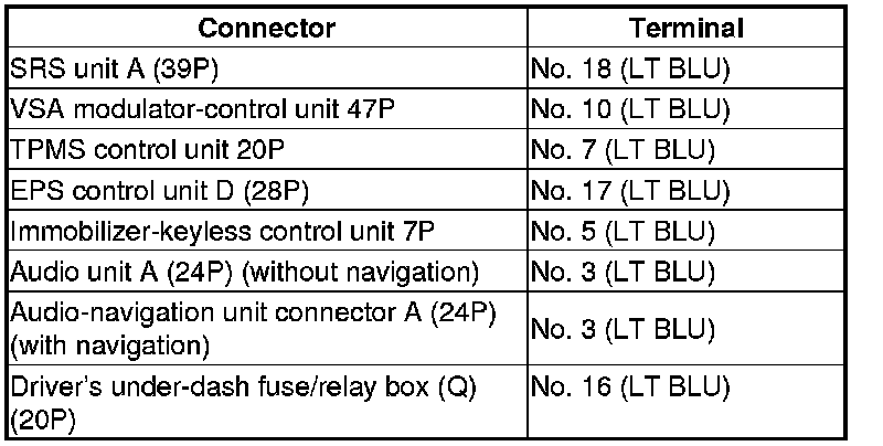 Repair short in the wire between the DLC (K-line) and the VSA modulator-control unit, the SRS unit, the TPMS control unit, the EPS control unit, the immobilizer-keyless control unit, the audio unit, or the driver's under-dash fuse/relay box.�