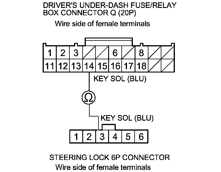 11. Check for continuity between driver's under-dash fuse/relay box connector Q (20P) terminal No. 14 and steering lock 6P connector terminal No. 3.
