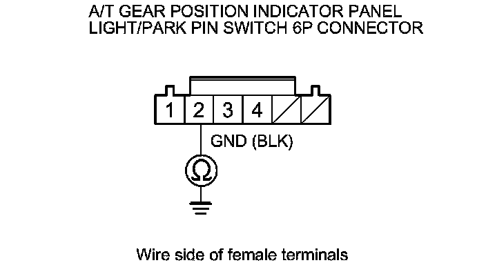 17. Check for continuity between A/T gear position indicator panel light/park pin switch 6P connector terminal No. 2 and body ground.
