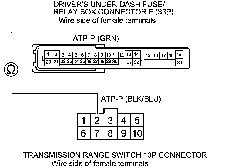 21. Check for continuity between driver's under-dash fuse/relay box connector F (33P) terminal No. 4 and transmission range switch 10P connector terminal No. 2.