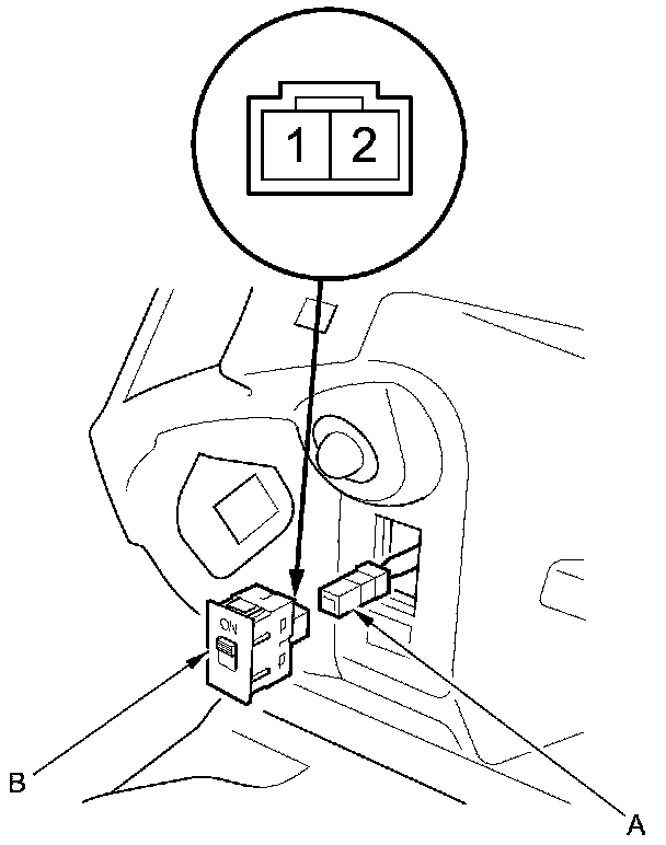 2. Disconnect the 2P connector (A) from the keyless access system mode switch (B).