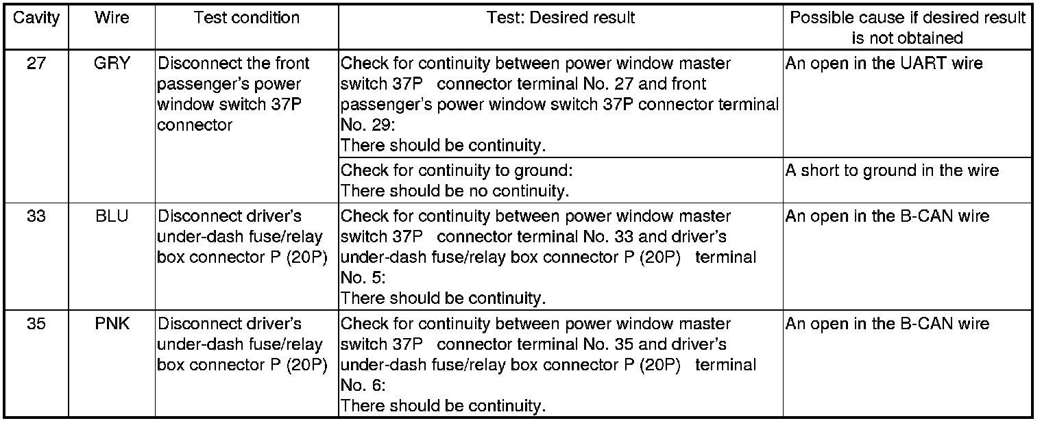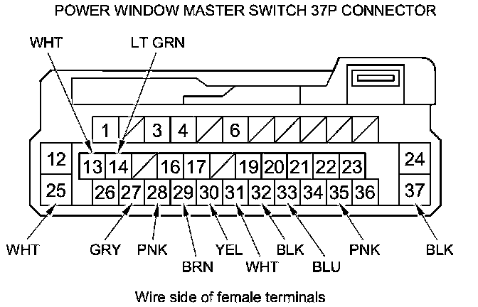 18. Reconnect the 37P connector to the power window master switch, and do the following input tests: