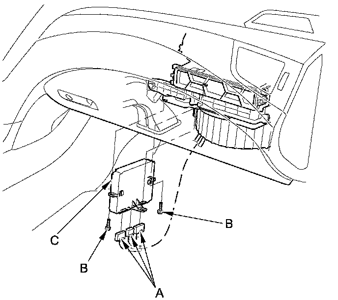 2. Disconnect the connectors (A). Remove the bolts (B) and the climate control unit (C).