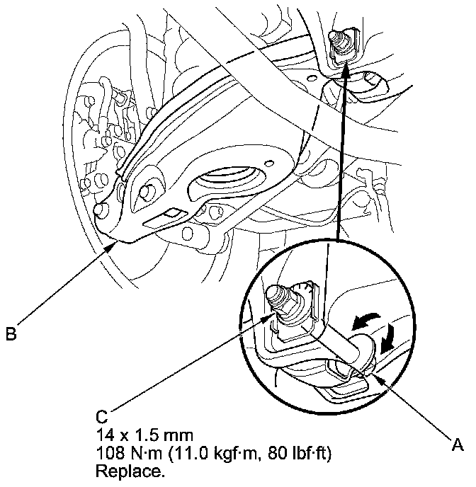 3. Hold the adjusting bolt (A) on lower arm B, and remove the self-locking nut (C).