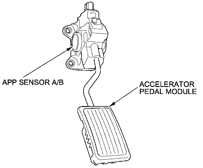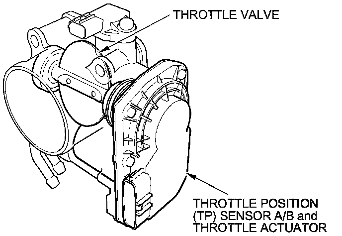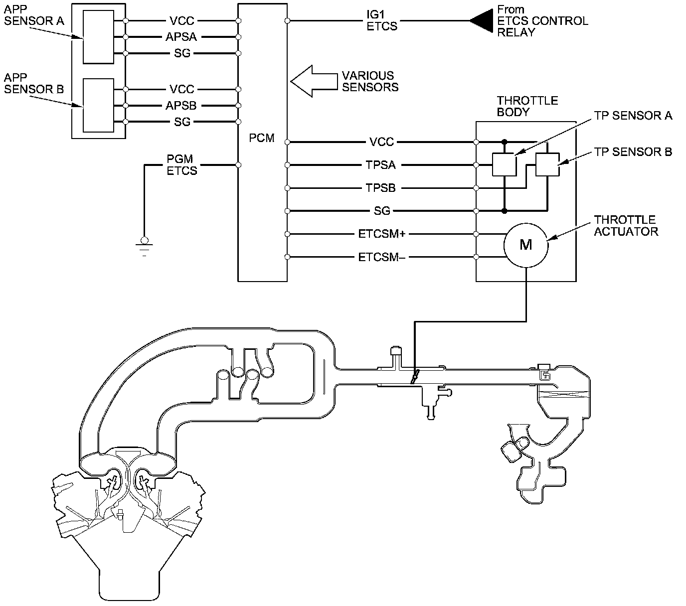 The electronic throttle control system consists of the throttle actuator, throttle position (TP) sensor A/B, accelerator pedal position (APP) sensor A/B, the electronic throttle control system (ETCS) control relay, and the PCM.
