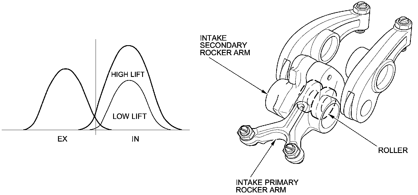 - The intake valve side has primary and secondary rocker arms. These rocker arms are locked and separated to change the cam profile by switching the oil passages. Roller rockers are used to minimize mechanical friction.